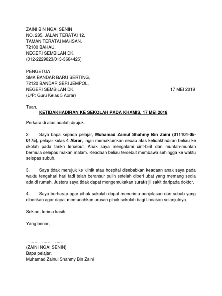 Potret botaknya itu pernah hadir di laman Instagram putri Nurul Arifin. Nampak rasionalnya dia membeli jaket itu untuk kegunaan d Seorang yang tidak beretika ketika berniaga. Contoh Surat Rasmi Tidak Hadir Ke Sekolah Sakit Demam Urusan Keluarga dan Sebagainya Berikut kita akan kongsikan contoh-contoh surat tidak hadir ke sekolah kerana atas pelbagai alasan surat rasmi mengikut beberapa jenis format surat serta contoh alasan munasabah tidak hadir ke sekolah yang kerap digunakan oleh pelajar sekolah untuk makluman.